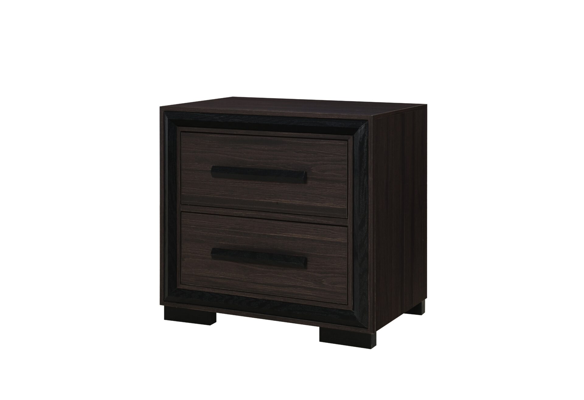 Complete your bedroom set with the Amelia Nightstand by Global Furniture USA, an ideal companion to the bed in this collection. Its compact design is perfect for keeping essentials within reach. The rich brown finish and black accent trim echo the contemporary aesthetic of the Amelia collection, while the sleek black drawer pulls add a touch of elegance. With ample space on top for a lamp or your current read, and drawers to store away small items, this nightstand is both convenient and stylish.