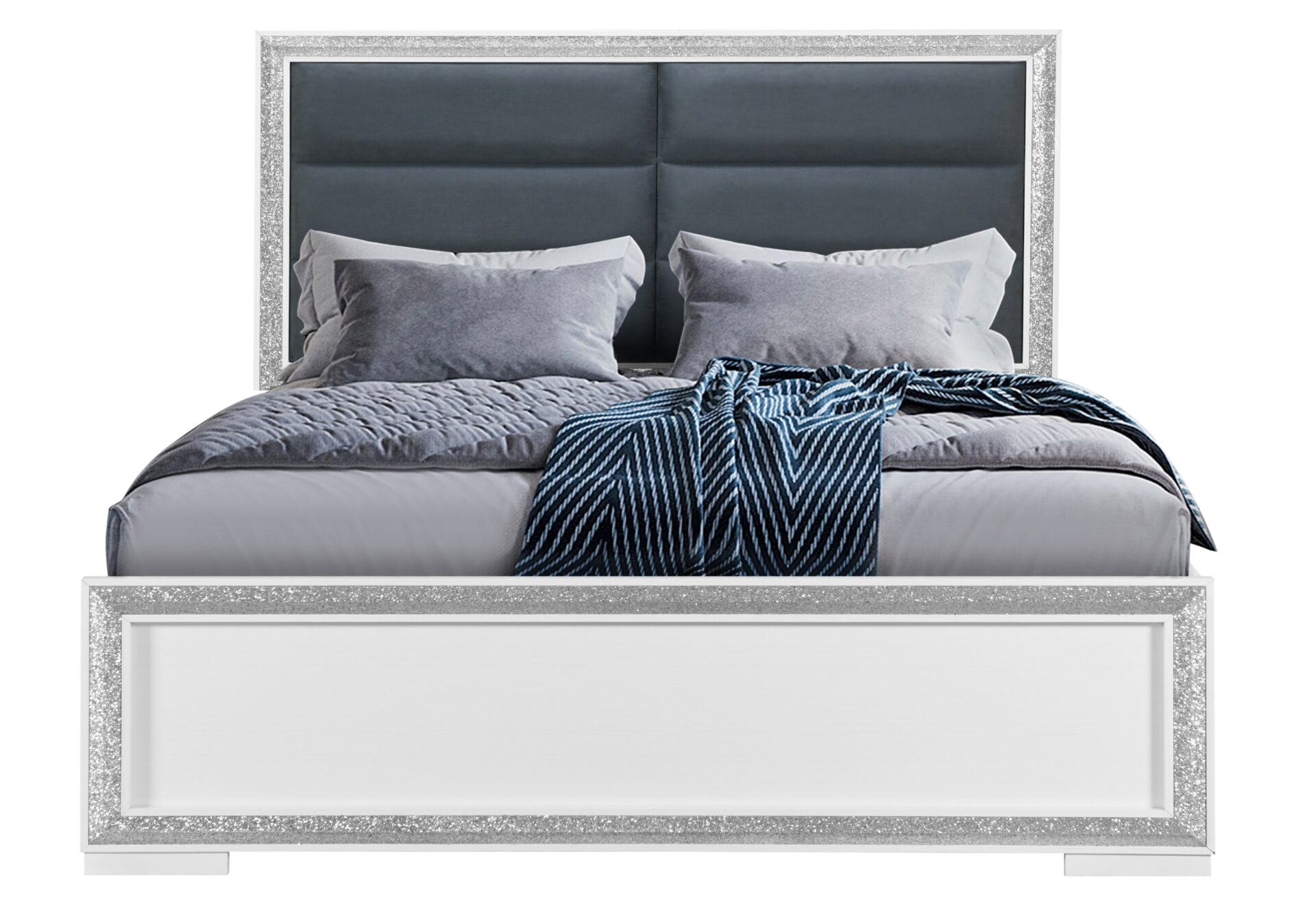 Elevate your bedroom to a realm of modern sophistication with the Andros Bedroom Collection by Global Furniture USA. This exquisite collection embodies contemporary elegance with a sleek white finish that radiates chic vibes throughout your sanctuary. Each piece in the Andros collection is accentuated with glamorous silver trim, adding a touch of sparkle and luxury that complements the minimalist aesthetic. The Andros Bed stands as the centerpiece, featuring a sumptuously upholstered headboard and captivating under-bed LED accent lighting that sets the mood for relaxation. The accompanying case goods, including the dresser, nightstand, and chest, boast sleek lines and glam drawer pulls that exude a polished, cohesive look. Envision a bedroom that’s not only a place for rest but also a statement of style—the Andros Bedroom Collection is the epitome of that vision.