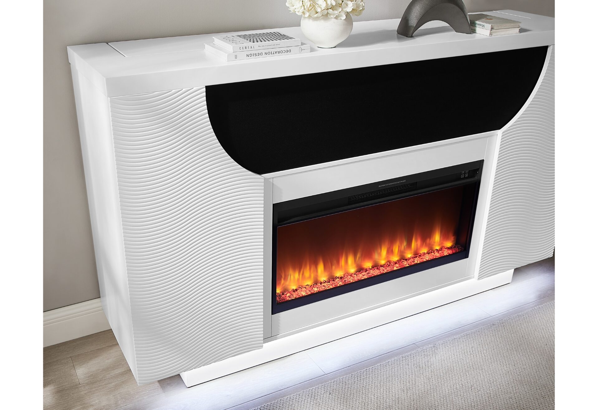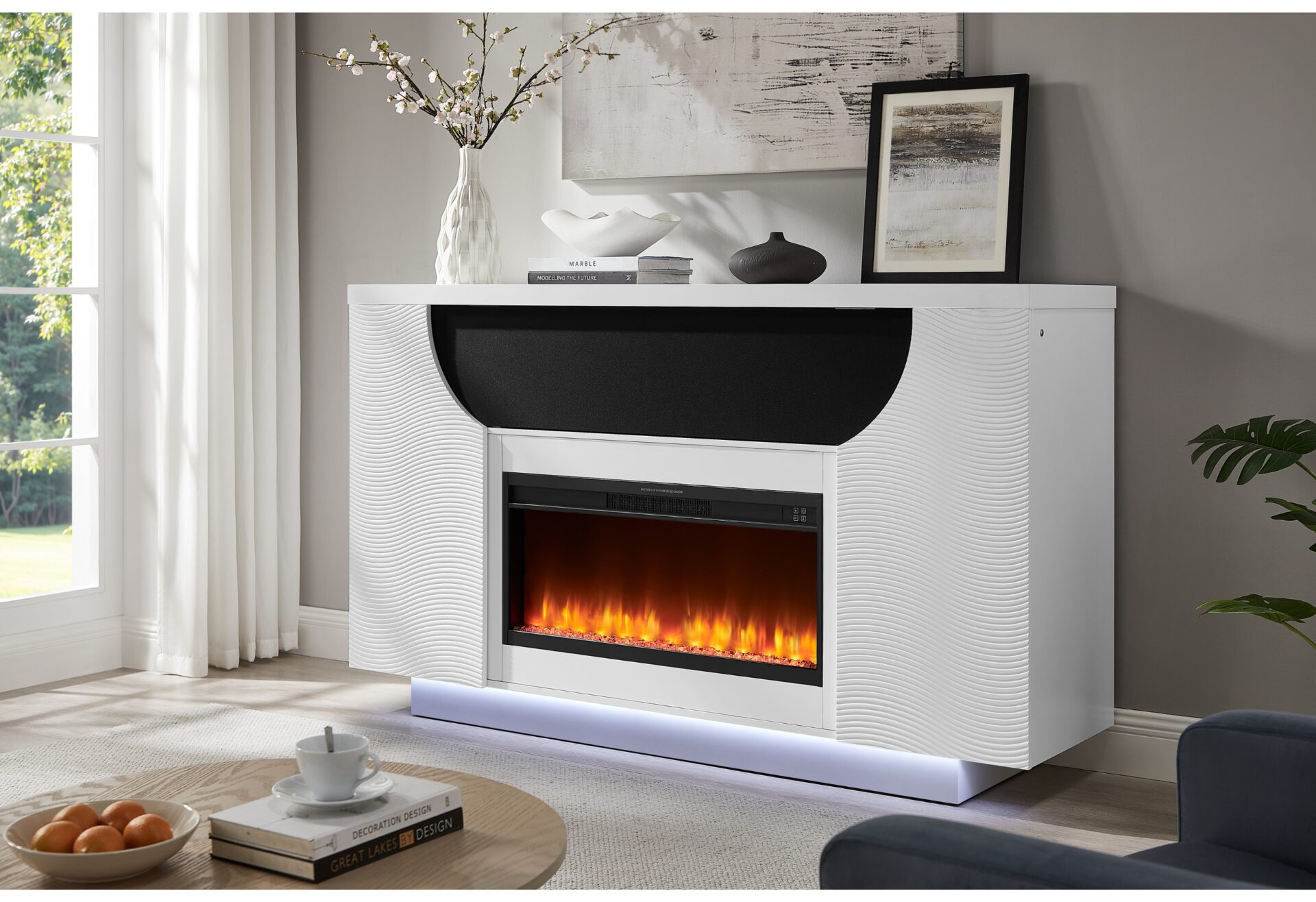 The Aveena 76-Inch Entertainment Unit by Global Furniture is a striking and functional addition to any modern living space. Finished in a sleek white lacquer, this contemporary fireplace combines elegant design with advanced technology. It features a TV lift mechanism that seamlessly raises and lowers your television, creating a clutter-free look when not in use, can fit up to a 75″ TV. The built-in LED lights provide customizable ambiance, while integrated speakers offer crisp, clear sound for an enhanced viewing experience. The dazzling crystal insert adds a touch of luxury, further elevating the fireplace’s visual appeal. The pop-up center doors reveal additional storage space, perfect for keeping electronics or accessories neatly tucked away. Whether for relaxation or entertainment, the Aveena Entertainment Unit brings sophistication and convenience to your home.