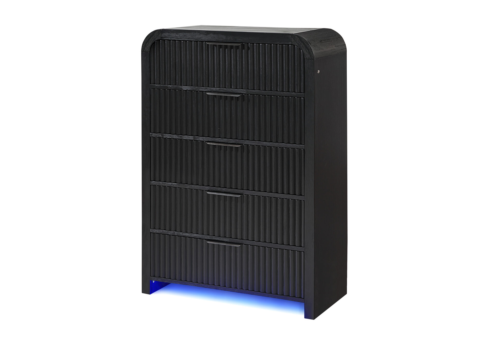 The Beckett Chest brings form and function together with a black finish, white faux marble top, and fluted drawer fronts that add texture and visual interest. Integrated LED lighting adds a touch of ambient sophistication, while the five roomy drawers provide practical storage.