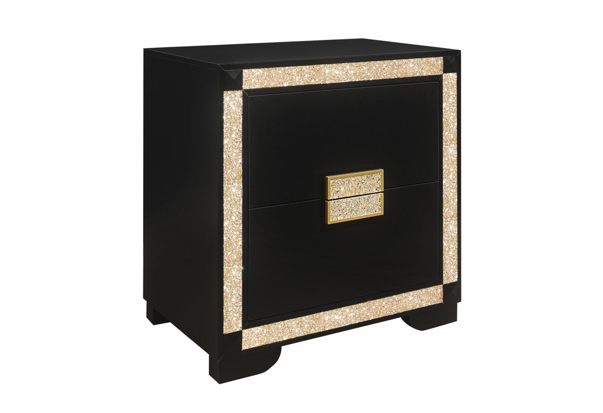 The Blake collection combines style and elegance with many beautiful features. The collection is outlined with gold colored crushed crystal to highlight its unique design. The Bed has a tall headboard and two lights along with quilted padding. The lights add style, design and function which can be used as reading lights. The quilted padding complements the design and adds comfort. All the other pieces have the black finish and crushed gold crystal outline complemented by the black and gold hardware.