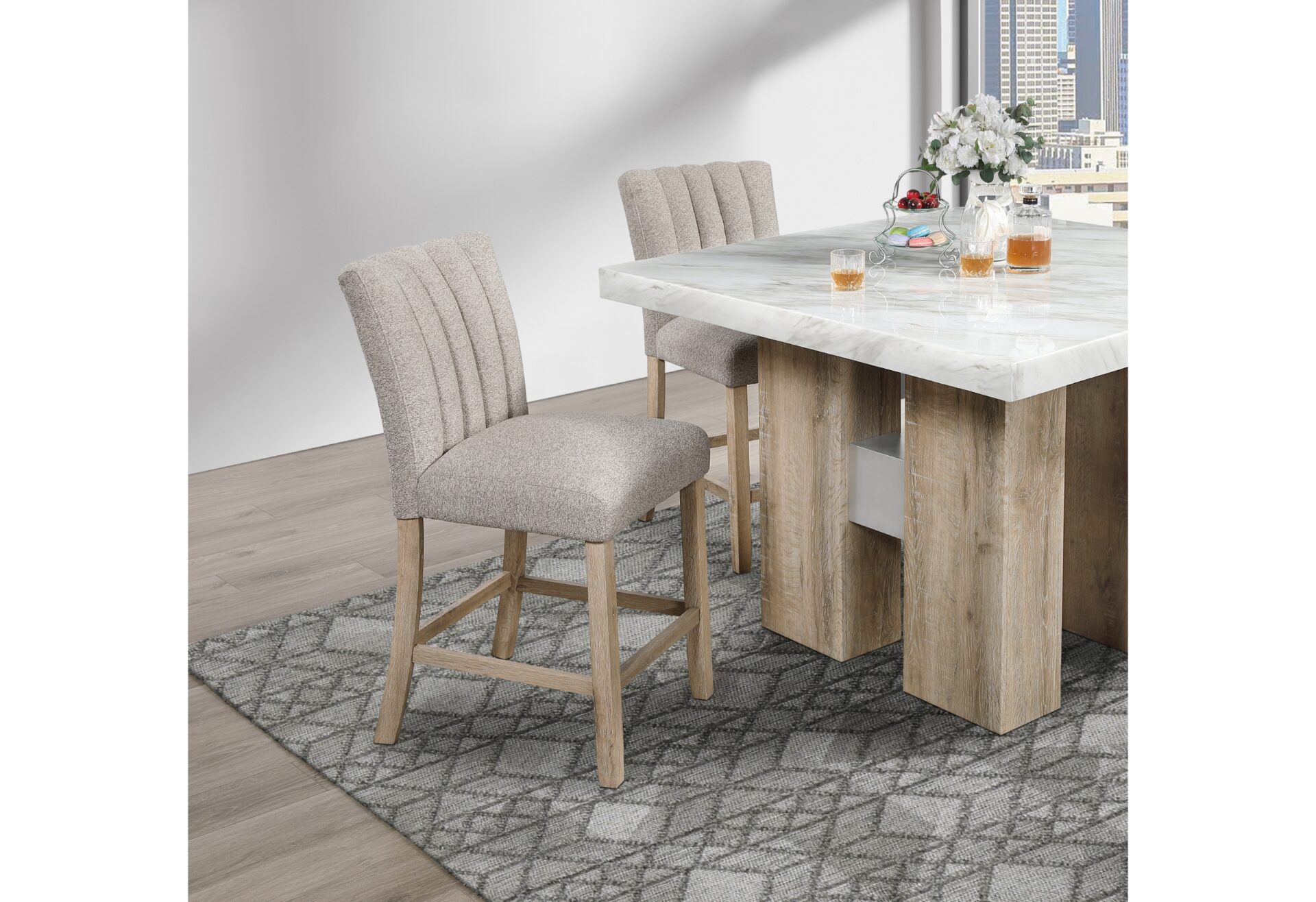 Elevate your dining or entertainment space with the D04 Bar Table and D8685 Bar Stool Collection by Global Furniture. This stylish and sophisticated set blends natural warmth with modern elegance, featuring a square bar table with a rich natural wood tone finish and a striking grey and white faux marble top. Paired seamlessly with the D8685 Bar Stools, upholstered in soft beige fabric with matching natural wood legs, this collection offers both comfort and contemporary charm. Whether for casual gatherings or chic dining experiences, this set is designed to enhance any space with its refined aesthetic and durable craftsmanship.