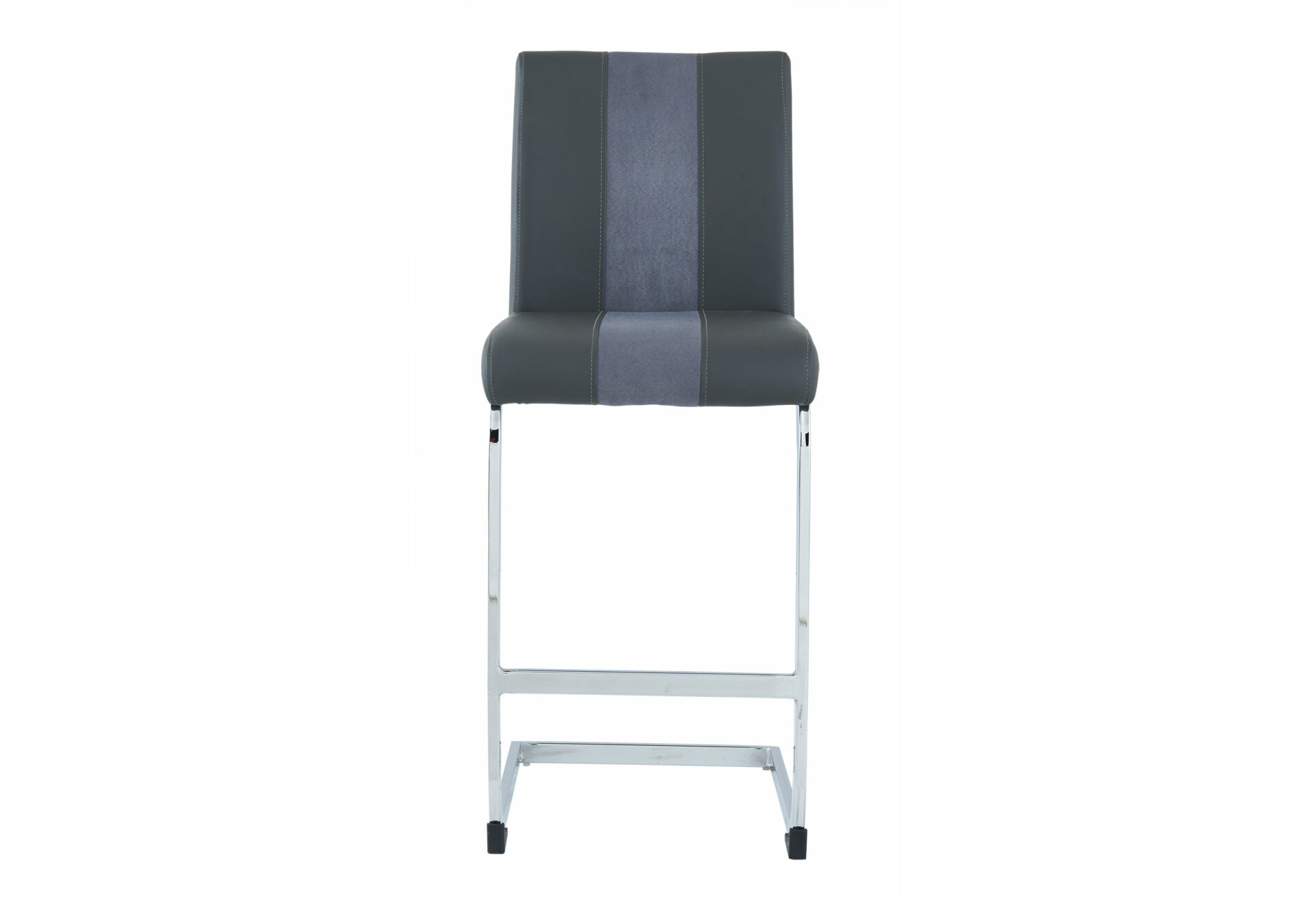 Perfect for your kitchen island or bar, this two-toned barstool will transform your room and add comfort and charm. This barstool is upholstered in tones of grey faux leather (PU) and fabric, providing an eye-catching and modern twist to traditional kitchen seating. Decorating possibilities are endless with the attractive tones of this piece. Additional design elements include a sleek style silver toned metal base and ample padding, continuing the delightful look and comfy feel of this seating. Quality craftsmanship in every facet of production ensures durability and long-lasting wear. For a stylish and modern take on kitchen or bar furnishings, this barstool is a can't miss choice in comfortable seating.