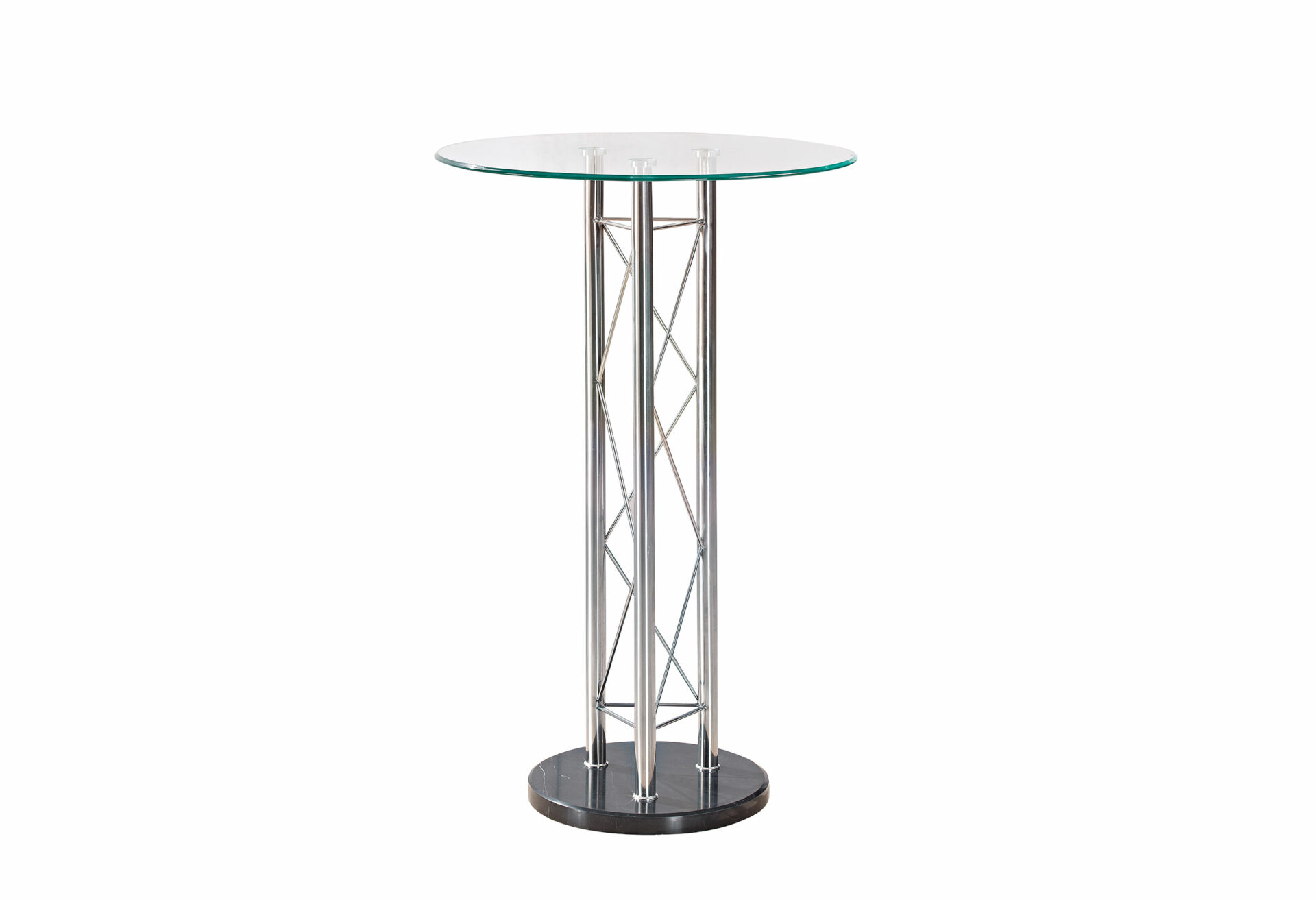 Enhance the trendy contemporary look of your casual dining area with this chrome metal circular bar table. Perfect for any space, this piece features straight tube legs with detail, glass top and a black finish on the base.