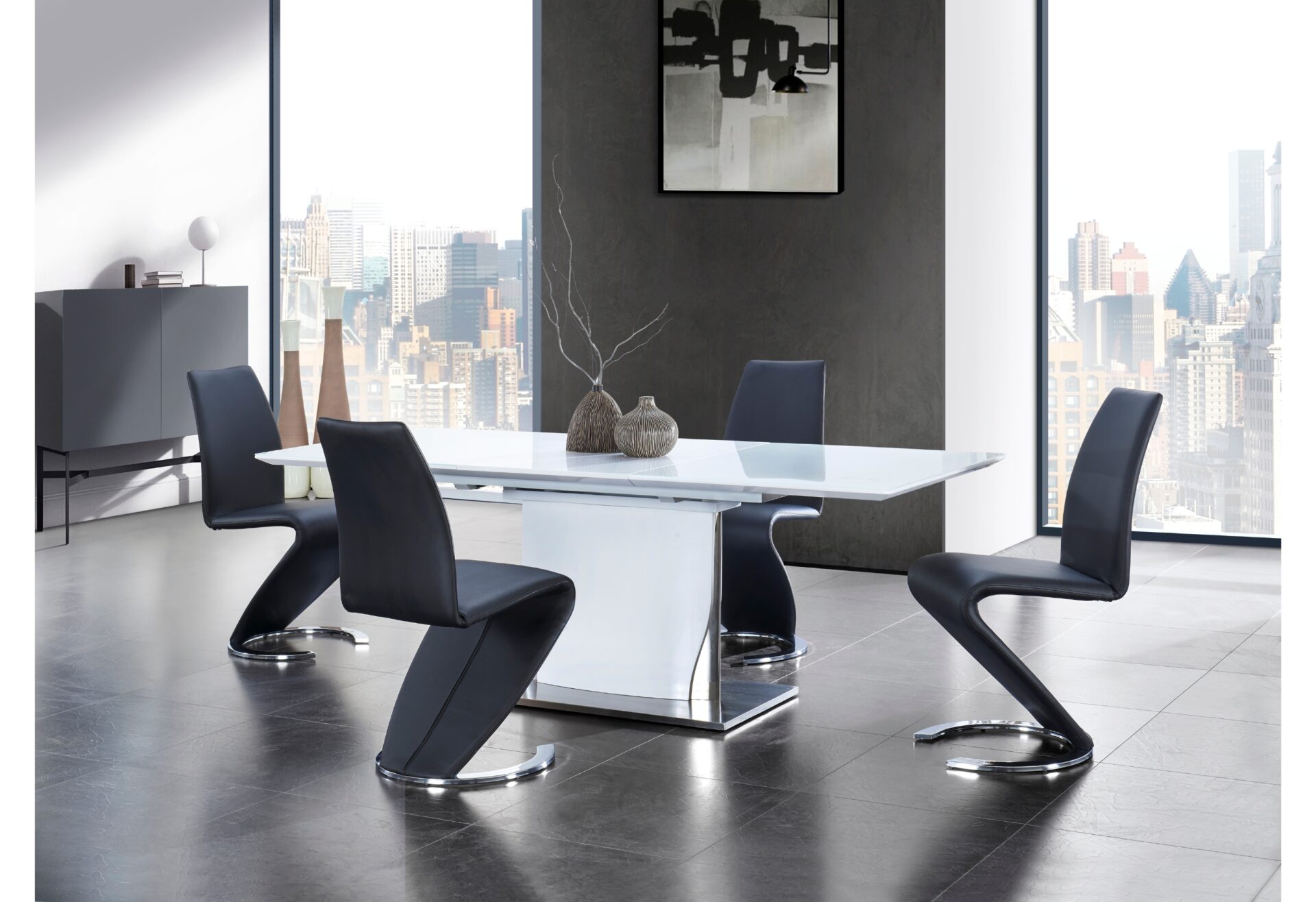 Enjoy cutting-edge and minimalist style that’s as eye-catching as it is practical for your contemporary dining space. A high gloss white finish with brushed stainless steel accents is sleek and on-trend. The glass top over white high gloss wood extends from 63in to 87in to accommodate all of your guests, and the self storing butterfly leaf hides seamlessly just below the tabletop when not in use.