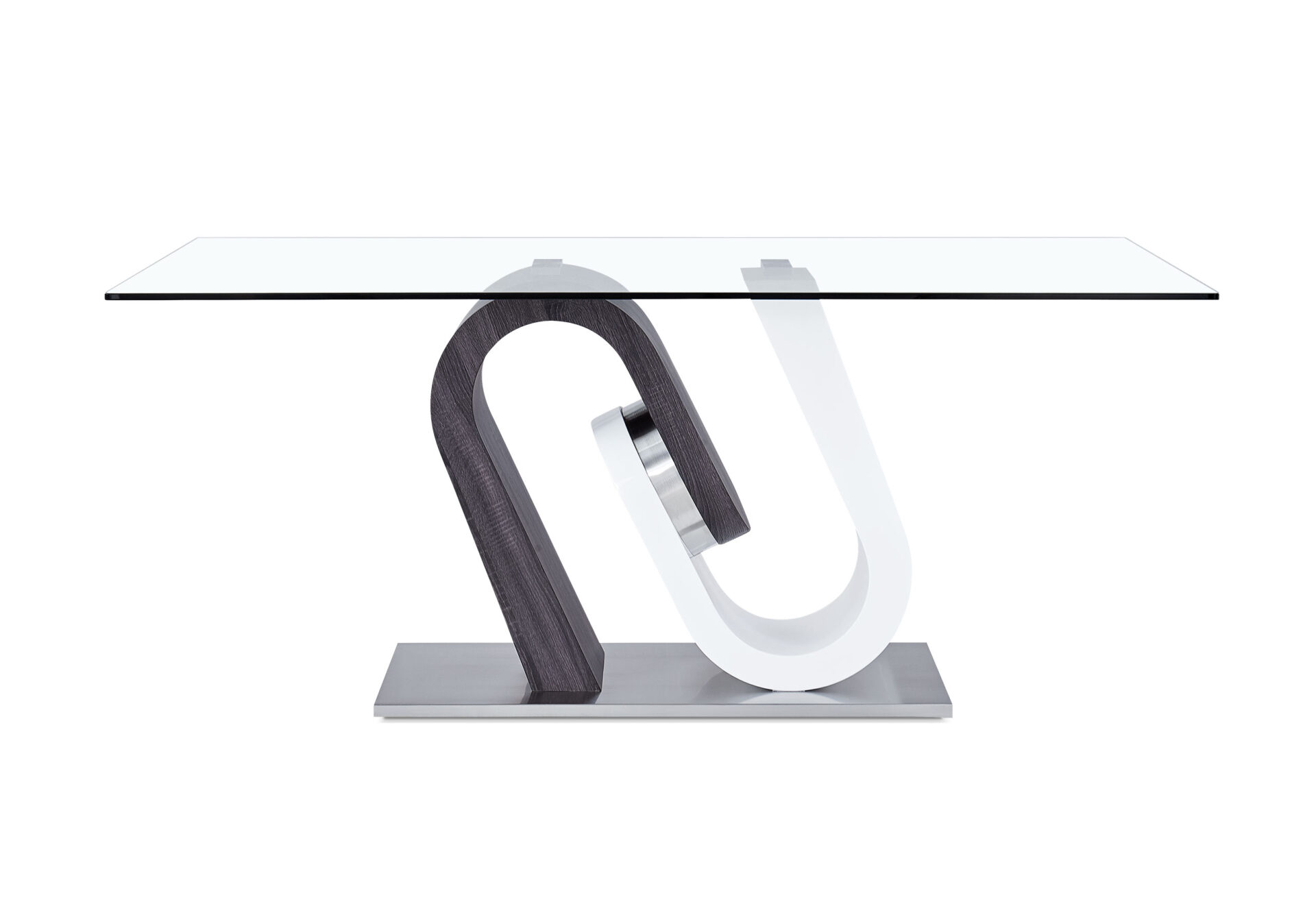 Looking to make an instant style statement then this clear glass top dining table is for you! Design elements include a two toned geometrically designed base fused with a polished chrome accent and a glass top providing enough space for all your entertaining needs.
