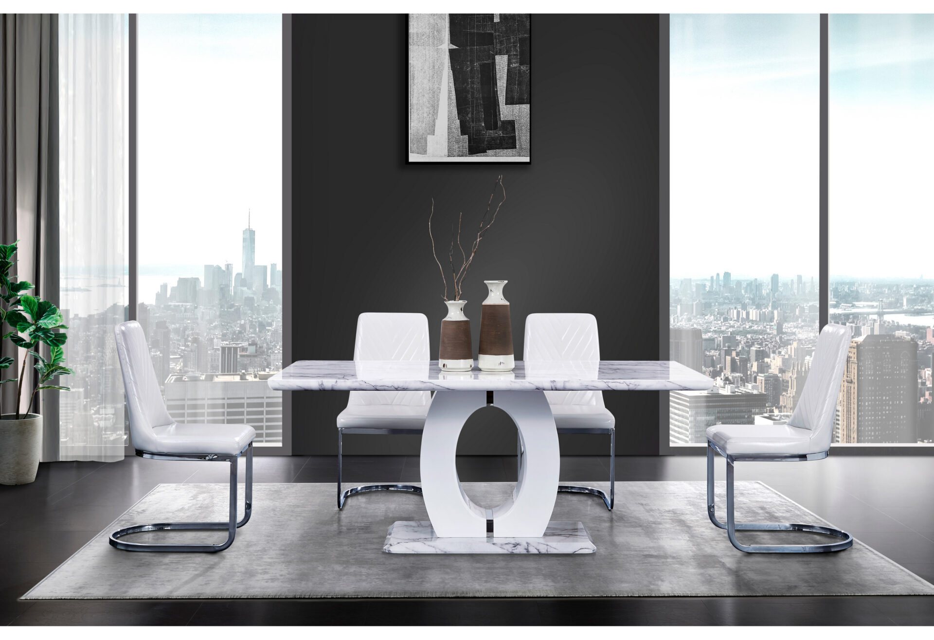 Dining rooms are often the most popular areas of a home and this classy contemporary dining table from Global Furniture shows why. This charming table includes a marble inspired top and base, Oval design style and chrome banding accents to create a warm and appealing entertainment setting.