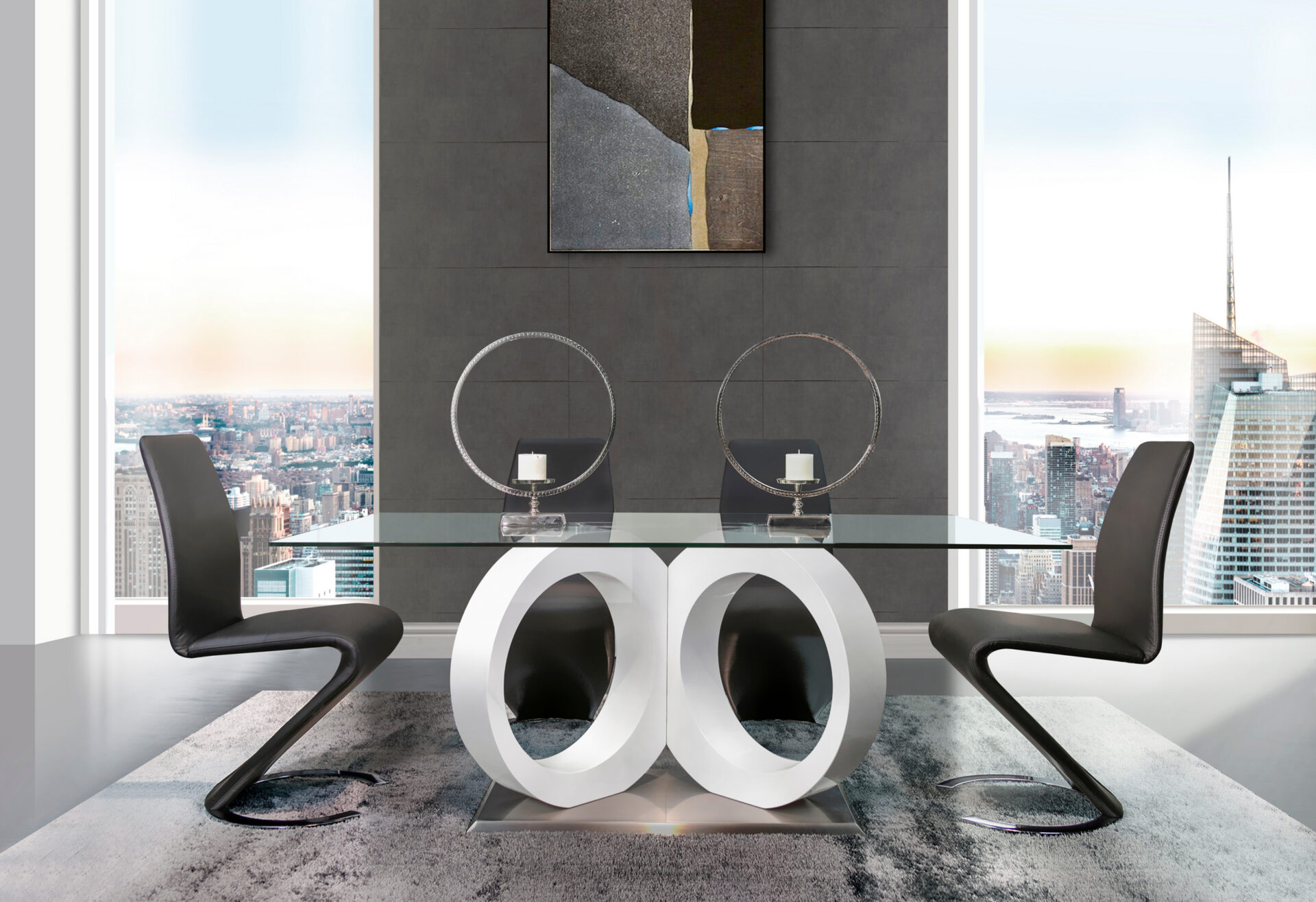 With its artistic design and geometric style this elegant dining table is just what your dining room needs. Featuring sculptural legs in a white finish, rectangular glass tempered top and chromed base to finish the look.
