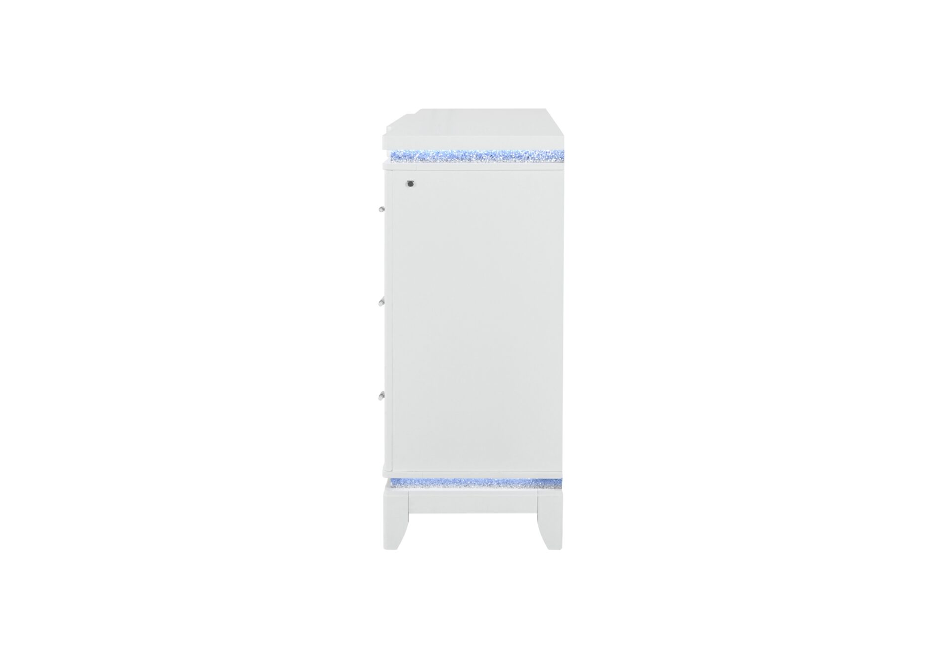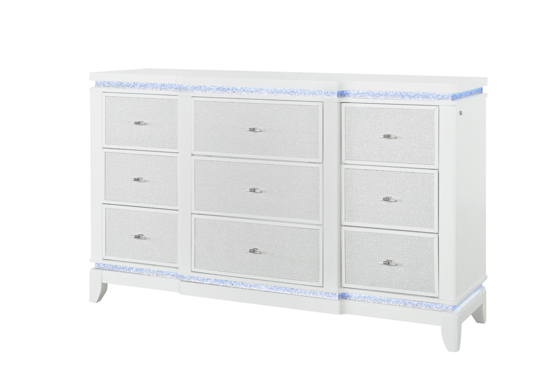 The Alina Dresser is an exquisite fusion of functionality and style. Its white finish harmonizes with LED-lit crushed glitter, while the perforated silver glam drawer fronts provide ample storage space that’s as accessible as it is striking. Each pull is a statement of luxury, ensuring your storage solutions are never dull.