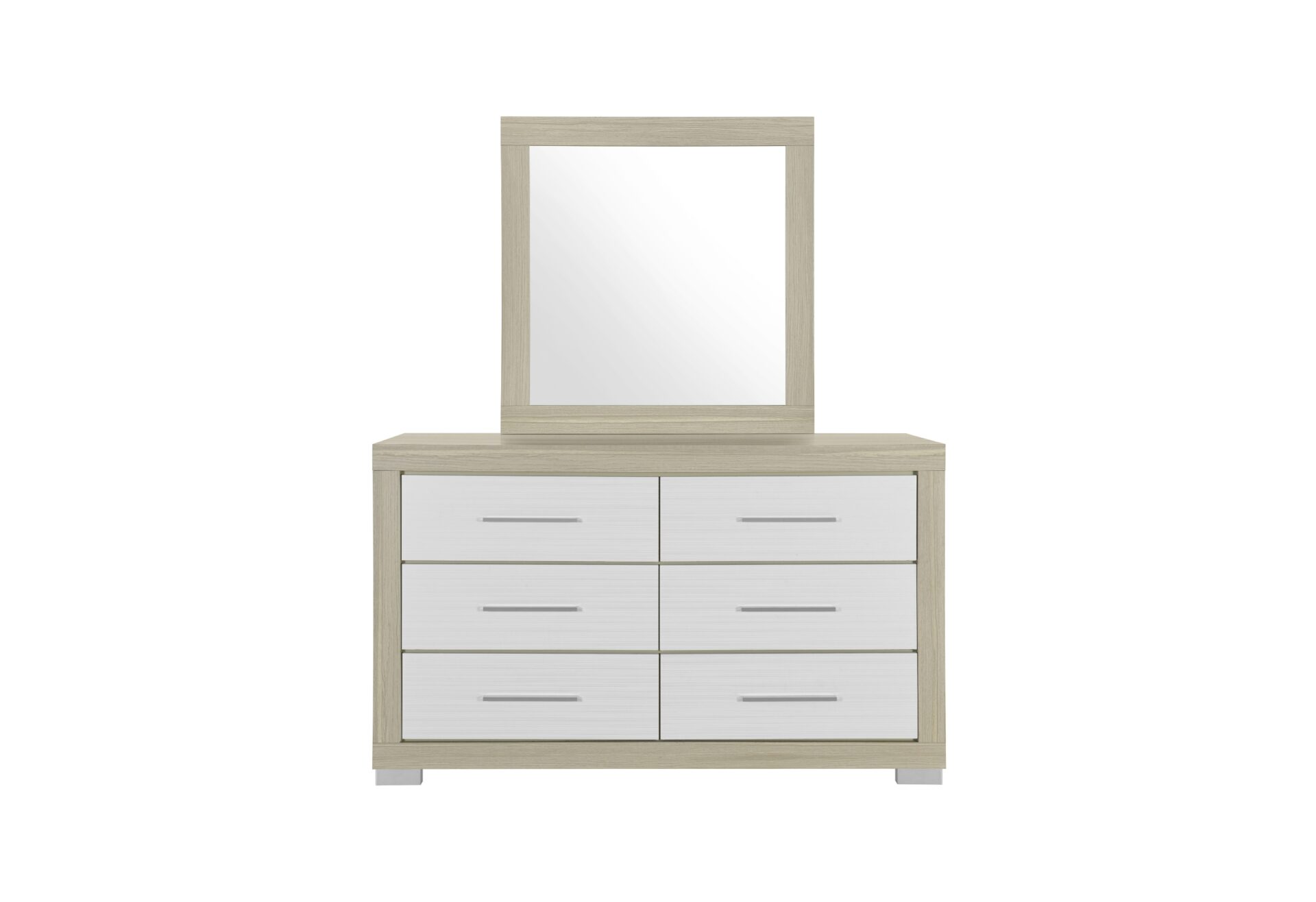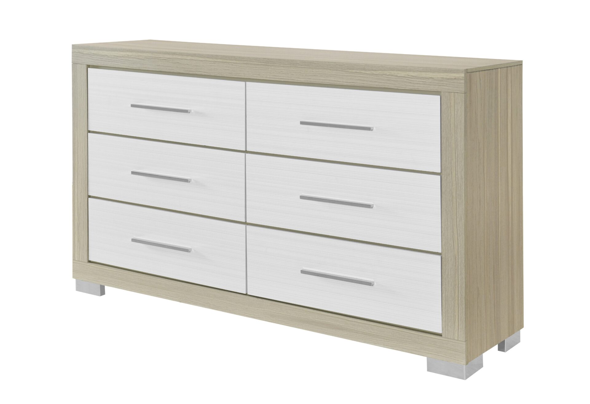 The Emma Dresser adds a touch of sophistication to your bedroom with its sleek two-tone natural wood and white finish. This dresser features multiple spacious drawers, ideal for storing clothing, accessories, and more. With its clean lines and modern design, it offers both style and functionality, perfectly pairing with other pieces of both Emma or Madison collections.
