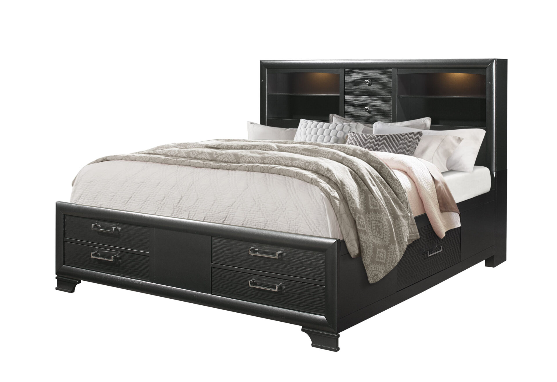 Introducing the Jordyn Bed Group from Global Furniture USA, the ultimate statement for any bedroom. The bed is designed with a platform design, eliminating the need for a box spring while adding room for storage drawers. The headboard features built-in lighting and two storage drawers for convenience. All case pieces are lacquer finished and feature nickel hardware. Upgrade your bedroom with the Jordyn Bed Group and enjoy its sleek and modern design for years to come.