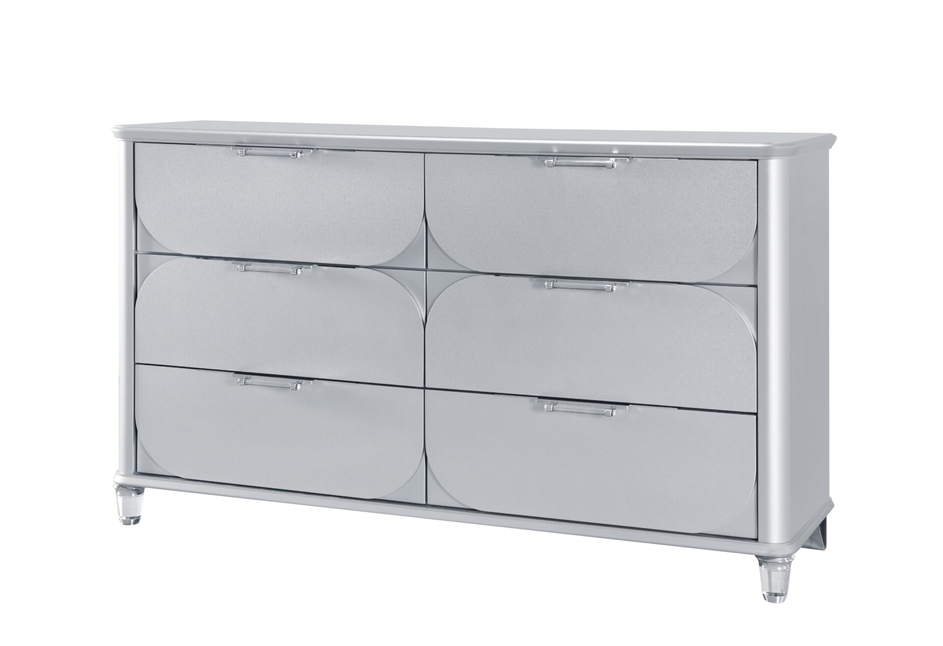 The Lando Dresser combines sleek design with practical storage solutions. Finished in elegant grey with acrylic accents, this dresser features spacious drawers with full extension glides, top felt-lined drawers, and textured drawer fronts. Two hidden jewelry drawers provide discreet storage for your valuables, making this dresser both stylish and functional.