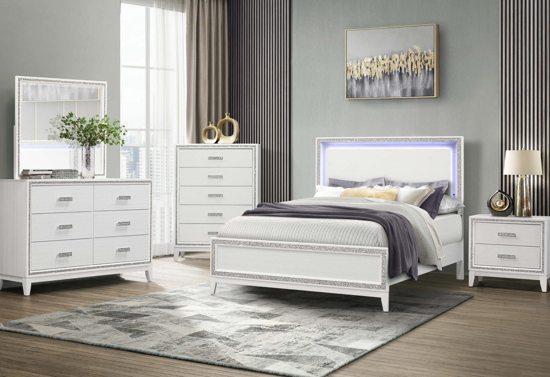 Lily bedroom brings two worlds together. The classic lines and modern accents create a beautiful transitional glam bedroom look. The crushed crystal like look outlines all the pieces along with LED lighting accenting the head board. The crushed crystal like design is not only used as an accent trim but is also carried over to the hardware. The end result is a beautiful glam bedroom.
