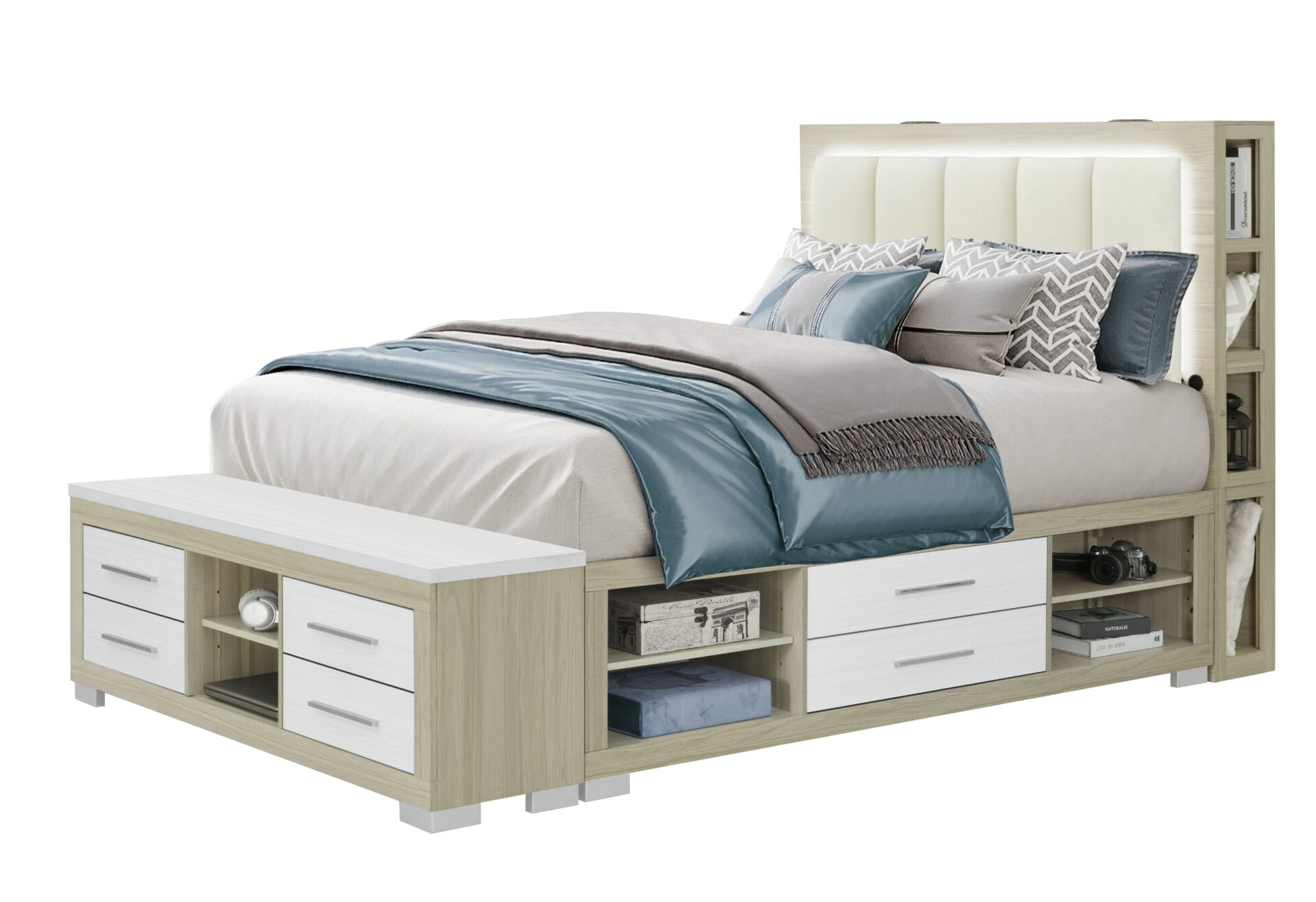 MADISON NATURAL/WHITE QUEEN BED HEADBOARD W/LED, USB, BLUETOOTH SPEAKER