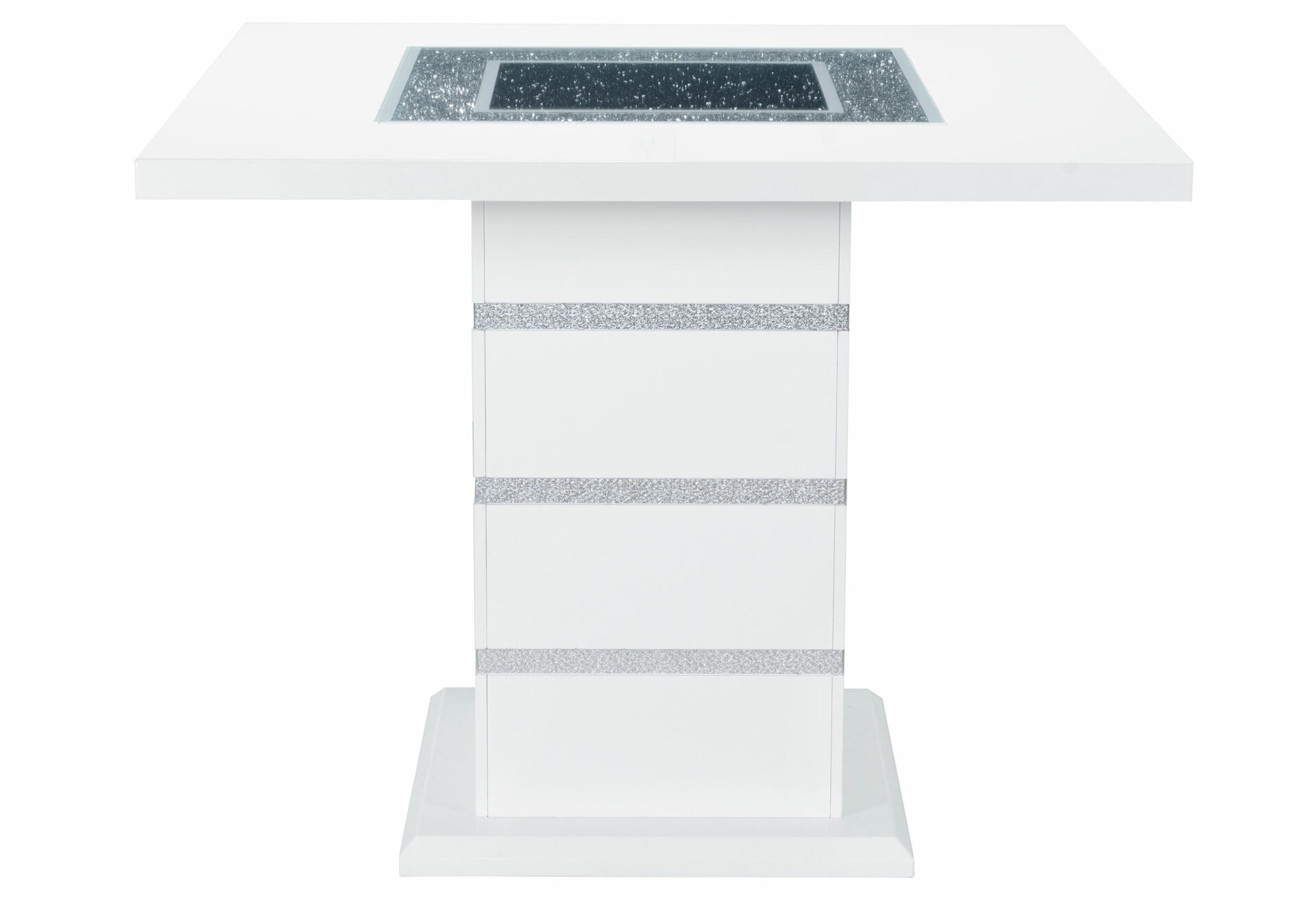 This bar table is a showcase example of how charm and a touch of elegance can dramatically change the look of your eating area. This table includes glitter detailing style elements with a sturdy construction and a high gloss finish with a clear glass inlay to round off the look. Constructed of MDF, Glass and Acrylic this dining table makes a bold statement. Finished in a White and Silver with a center glass, square shape and pedestal base you will have more than enough room to entertain and enjoy your dining experience.