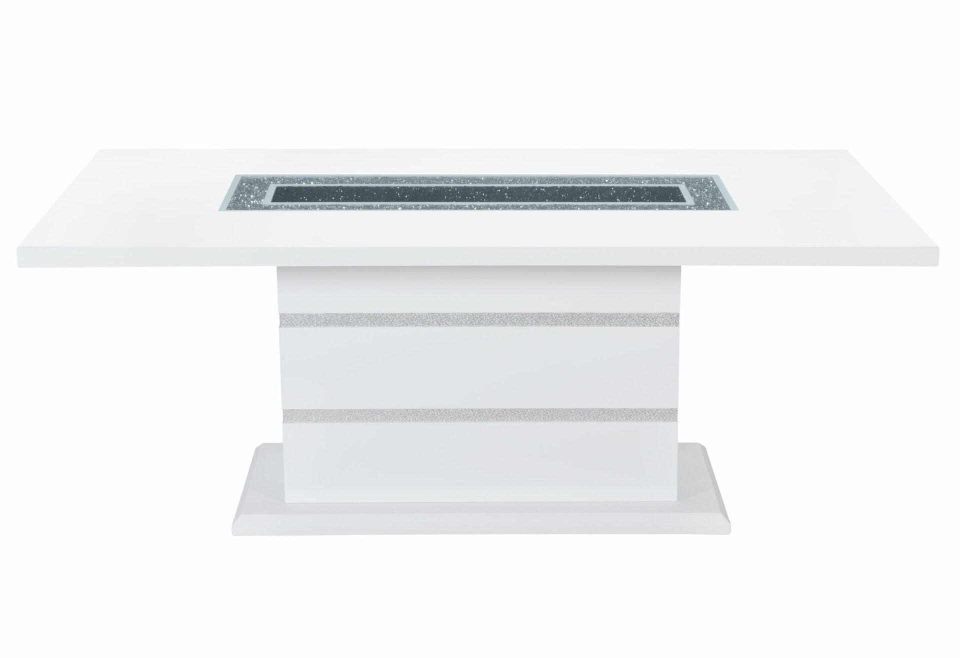 This dining table is a showcase example of how charm and a touch of elegance can dramatically change the look of your eating area. This table includes glitter detailing style elements with a sturdy construction and a high gloss finish with a clear glass inlay to round off the look. Constructed of MDF, Glass and Acrylic this dining table makes a bold statement. Finished in a White and Silver with a center glass, rectangle shape and pedestal base you will have more than enough room to entertain and enjoy your dining experience.