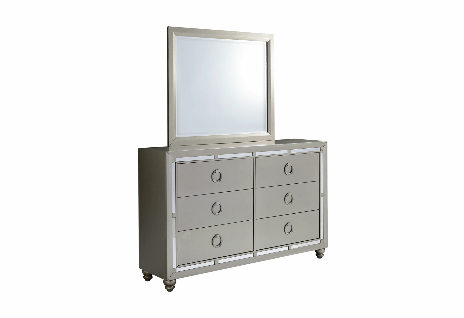 The Riley puts a contemporary spin on old-world style. The luxurious silver finish and mirror accents add sleek, ultramodern touches, while a tufted headboard and footboard echo the traditional style of upscale, craftsman made furniture.