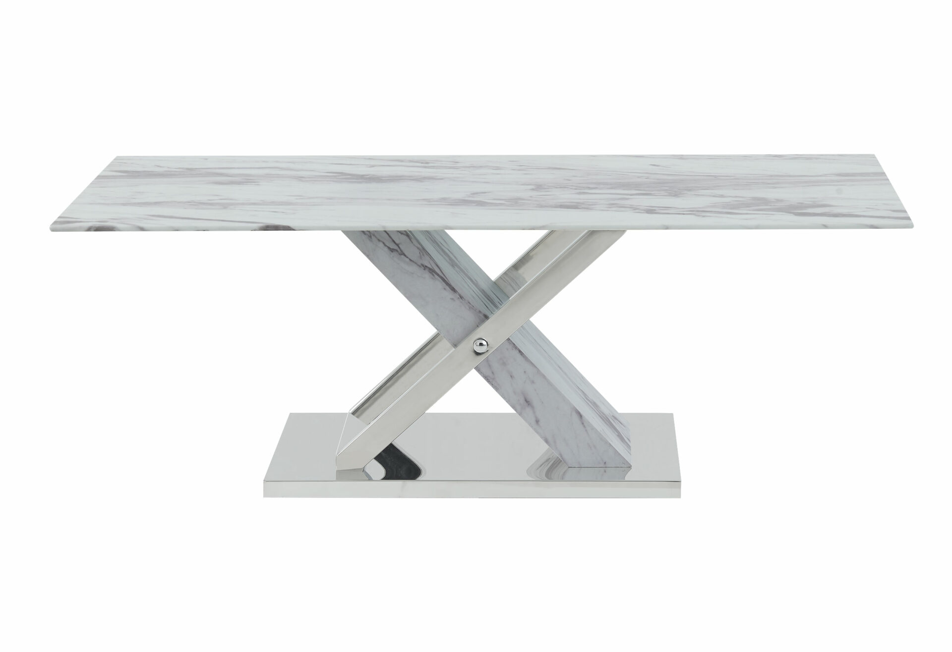 Get all the look of elegant Carrara marble with this stunning yet practical glass-top occasional table. Design elements include an x-base design with polished stainless steel accents. This table offers plenty of style and will be the focal point of your living space.