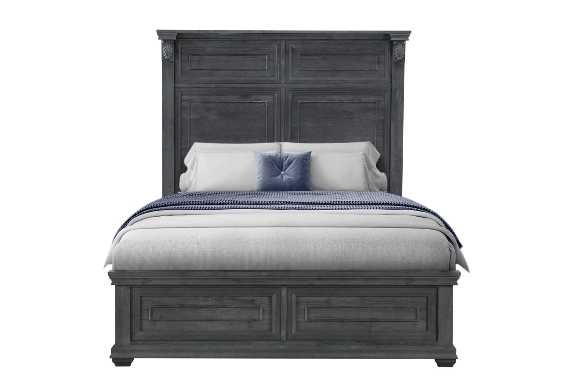 The Tatum Bedroom Collection is crafted with a rustic wood finish available in natural or grey, this classic collection boasts intricate trim, rustic drawer hardware, and elegant scroll work on every piece. The large panel headboard on the bed adds a grand touch to your bedroom.