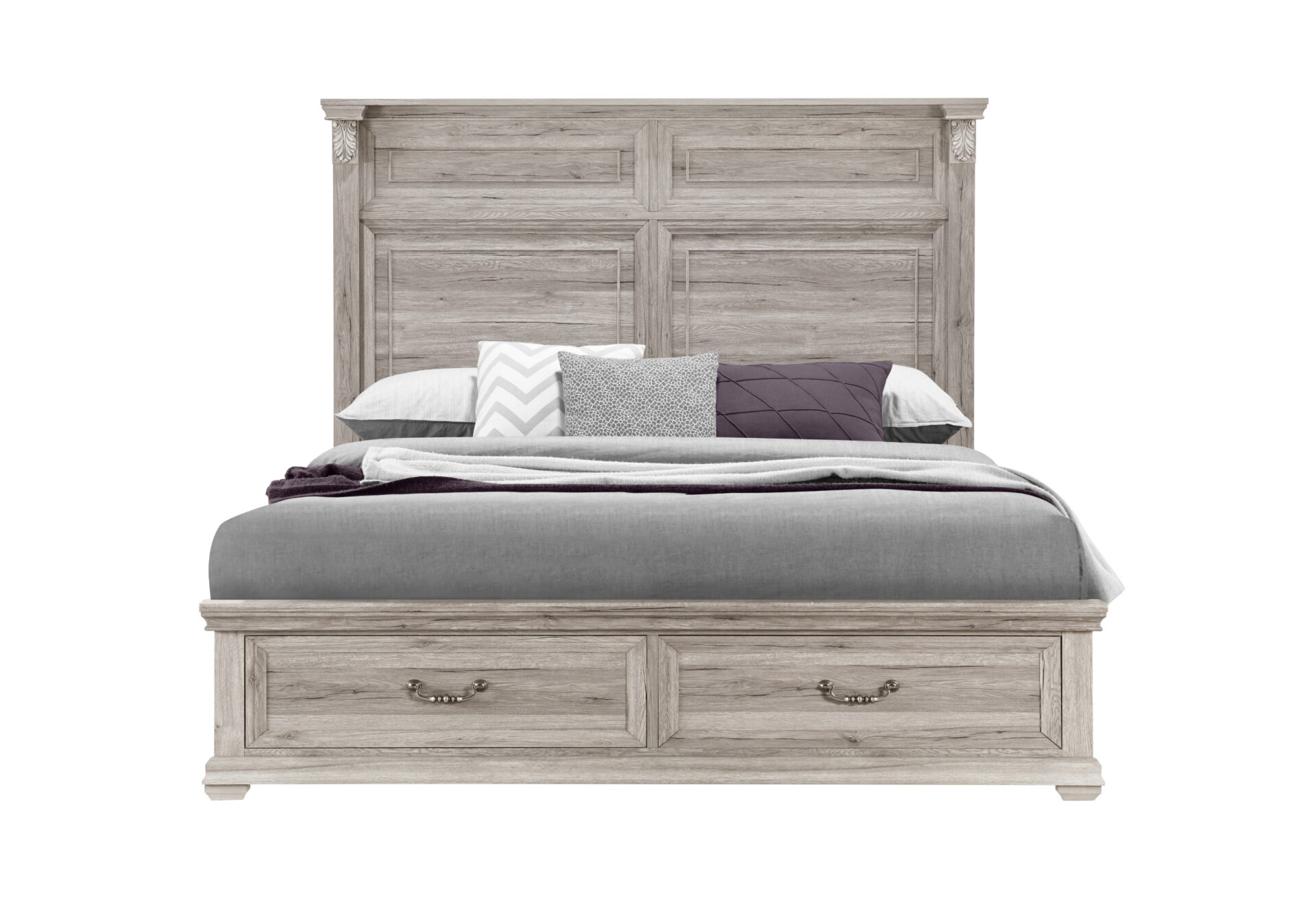 The Tatum Bedroom Collection is crafted with a rustic wood finish available in natural or grey, this classic collection boasts intricate trim, rustic drawer hardware, and elegant scroll work on every piece. The large panel headboard on the bed adds a grand touch to your bedroom. The footboard storage enahnces the functionality of the Tatum set maximizing the benefits.