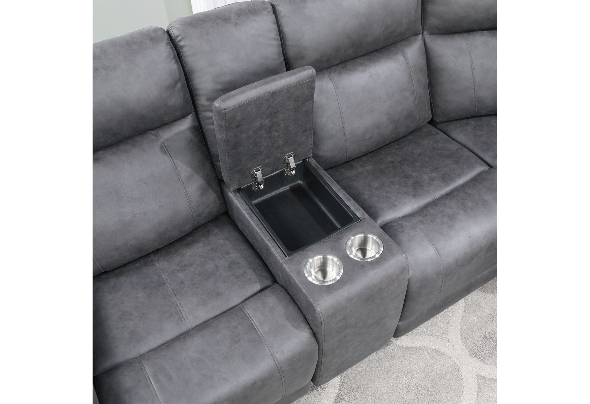 The transitional style of this beautiful motion group offers contrast baseball stitching and leather like welts along the arm and seat. The saddle bag arm adds comfort and style. The console loveseat offers a lift up storage table and two metal cup holders. Along with style and comfort, this collection includes a power recline function.