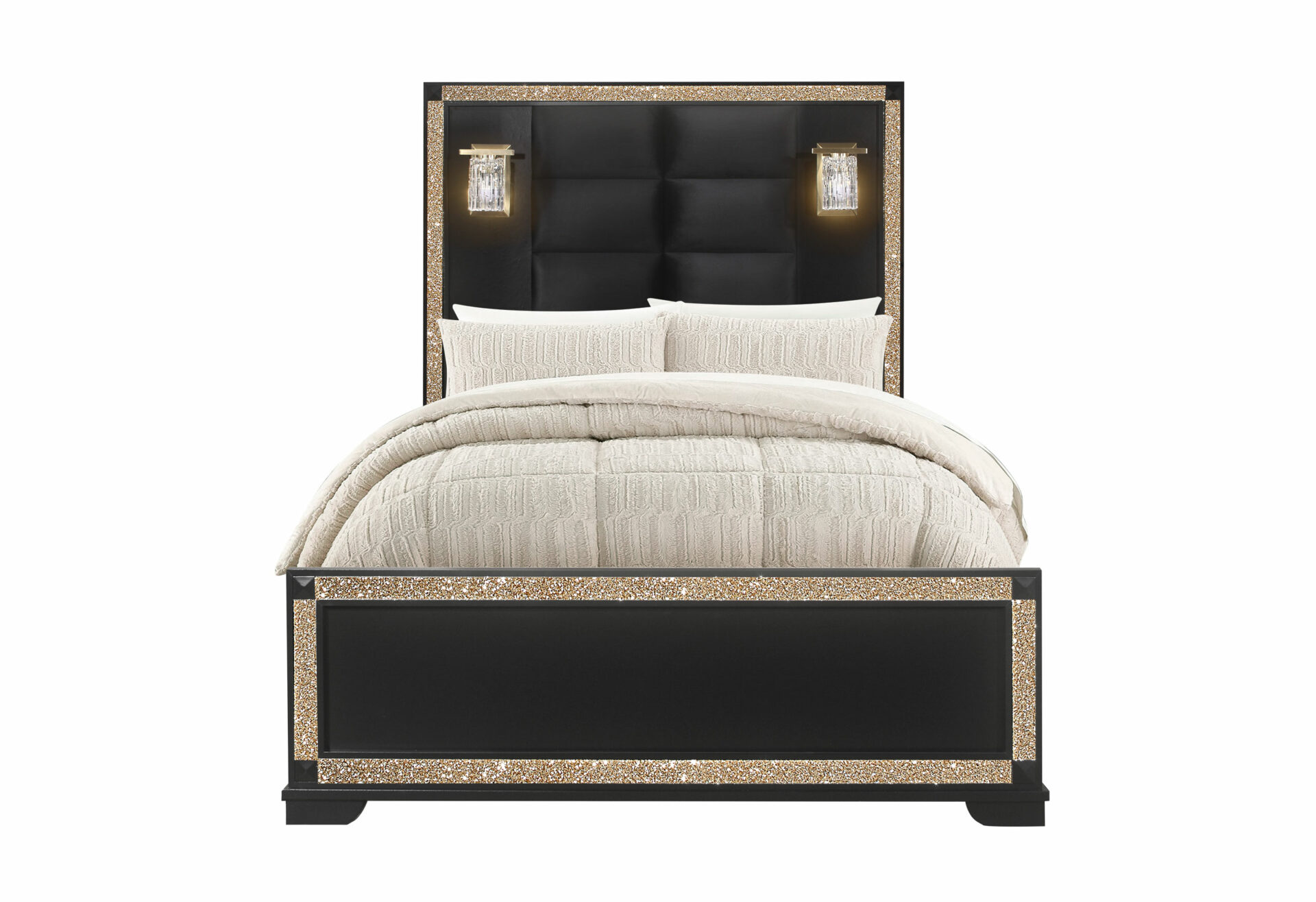 The Blake collection combines style and elegance with many beautiful features. The collection is outlined with gold colored crushed crystal to highlight its unique design. The Bed has a tall headboard and two lights along with quilted padding. The lights add style, design and function which can be used as reading lights. The quilted padding complements the design and adds comfort. All the other pieces have the black finish and crushed gold crystal outline complemented by the black and gold hardware.